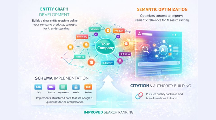- Entity graph development. The agency builds a clear entity graph that defines your company, products, modules and related concepts. This helps AI models understand how your offerings relate to one another and to industry categories.